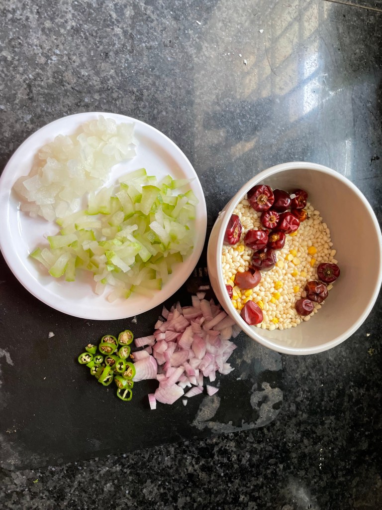 - Cube the ash gourd and add a tsp salt, mix and keep.