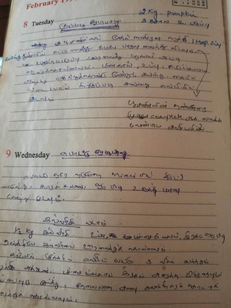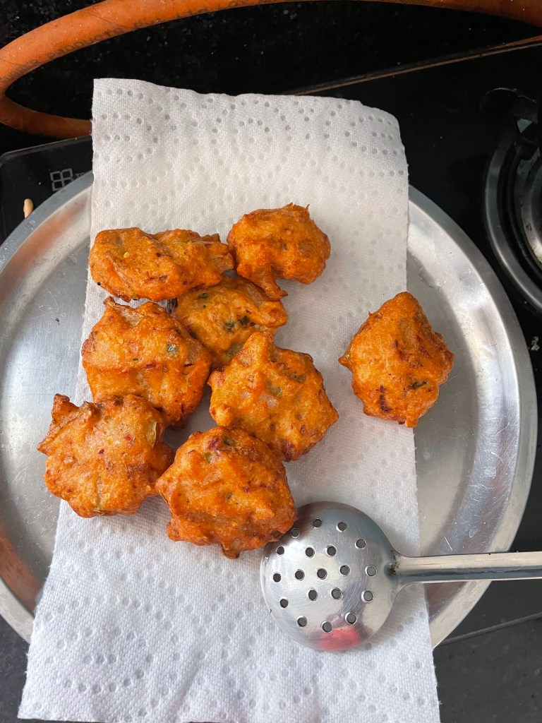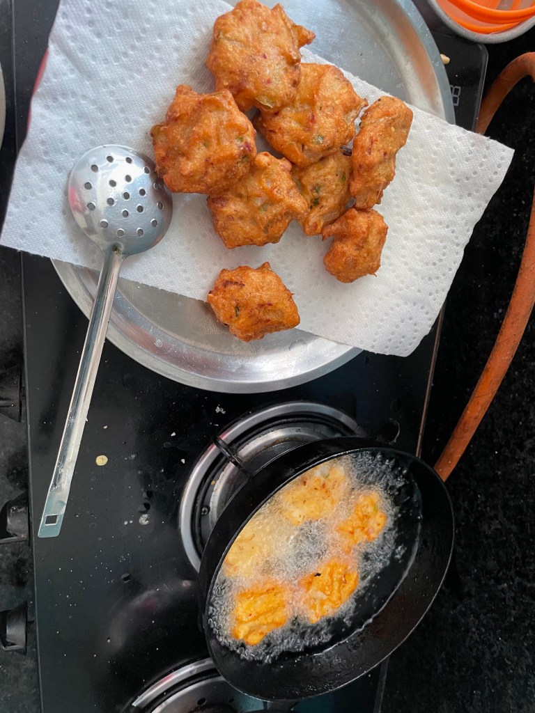 In the summer, when people prepare huge quantities of odiyam batter for drying, they reserve a small portion for that day’s lunch menu. The batter is flattened like vada (or the odiyam) and deep fried in oil right away. The spicy, mouthwatering delights are served hot as rice accompaniment. They are very special.