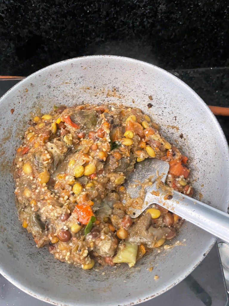 - In a pressure cooker add brinjal cut into large pieces and the legume of choice – chana, broad beans, broad bean seeds or mochai. Add salt, turmeric and water and cook for 2, 3 whistles (until the legume cooks)