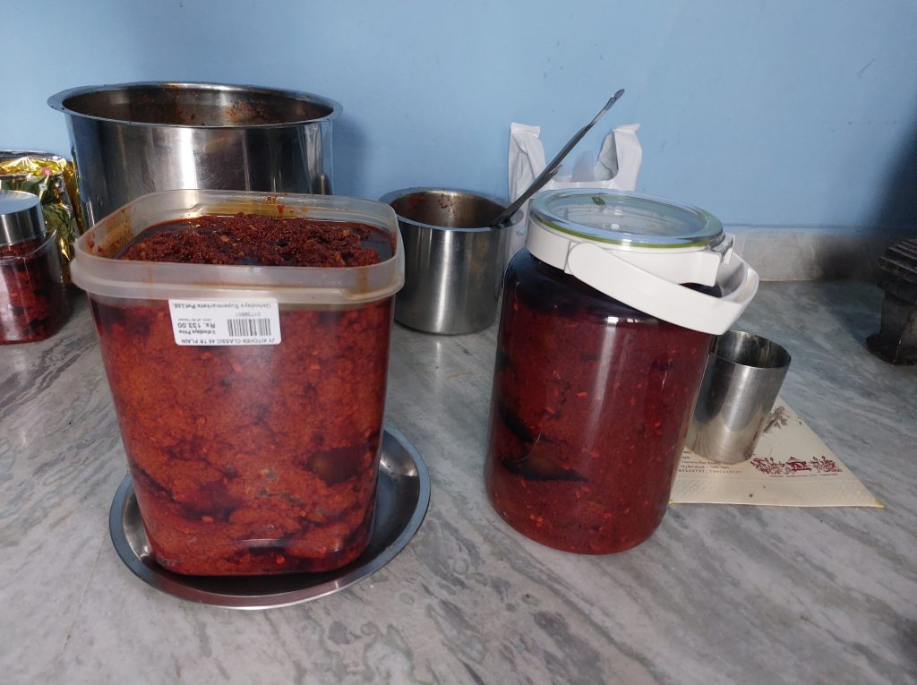 Mothers prepare large quantities of pickles to give their children, particularly daughters. It is an annual allowance taken for granted. While daughters who got them from their mothers for a great number of years boasted about it, women who weren’t in such a position and so started making them from an early age boasted about their pickling age! I belong to the second category.