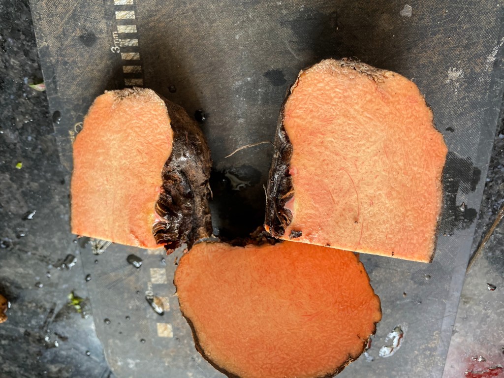 - Clean and peel kandha taking necessary precautions (in note) and slice into pieces. Keep in salt water.