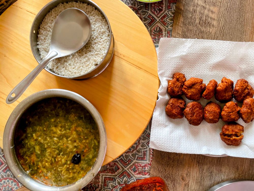Kandha vada aka odiyam is a tasty side-dish for rice. Kanda or kandha is elephant foot yam (senai kizhangu in Tamil). This tuber is ground with lentils and rice and deep fried in oil as spicy vada. These are eaten with rice with a bit of ghee or oil like kura. Accompanied by some pulusu. It is an interesting dish that is a favorite of everyone. Amma used to prepare these for lunch on holidays.