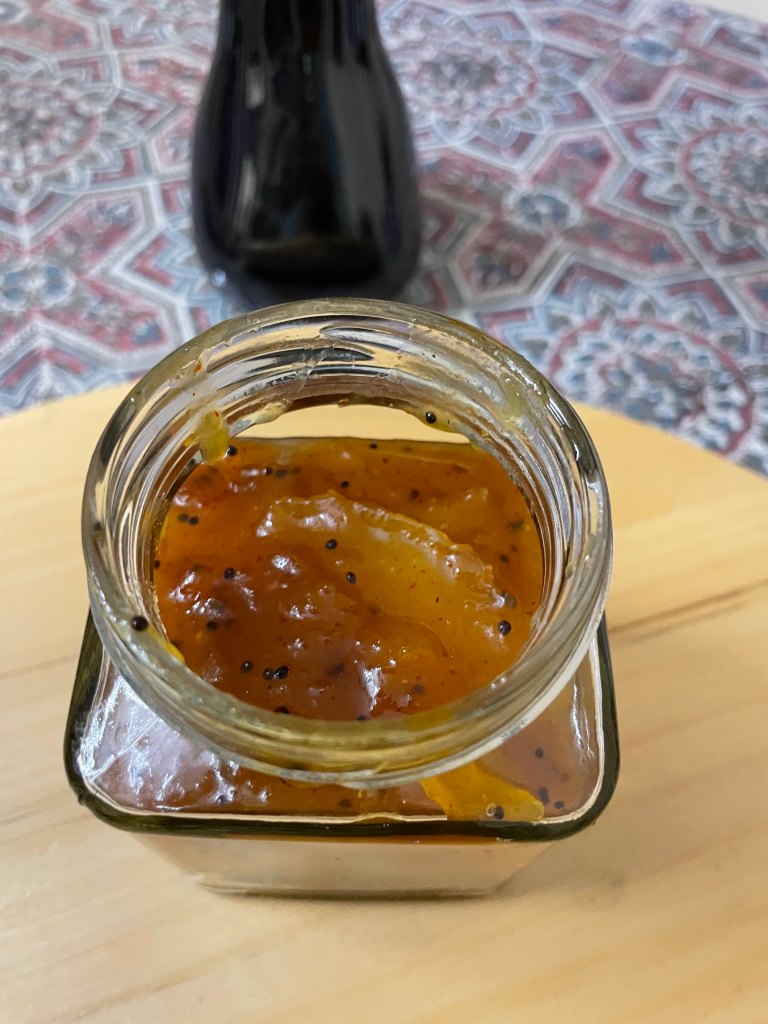 - Jaggery thickens, now add mustard-methi powder, chilly powder and cook another minute.