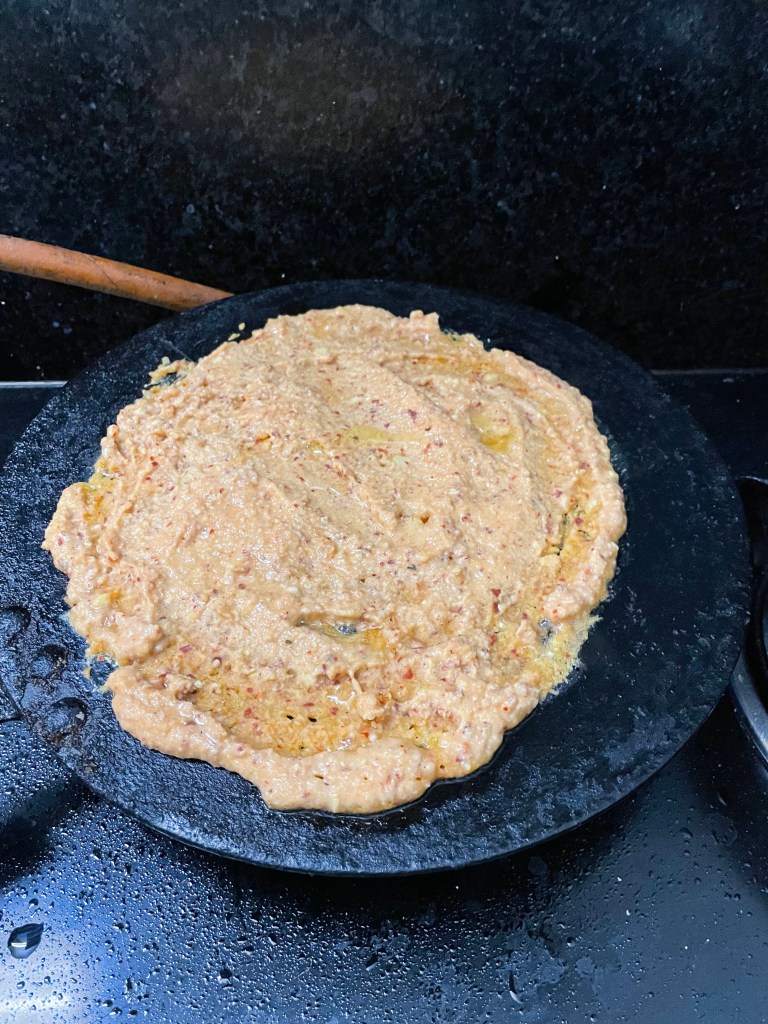 - Pour adai batter on hot tawa, spread it the way you like and sprinkle oil liberally around it and let it become golden on the underside..