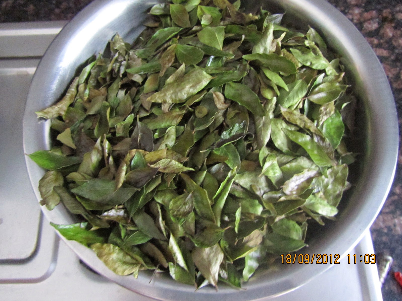 - Wash the curry leaves in water and spread on clean cloth overnight or until they are completely dry.