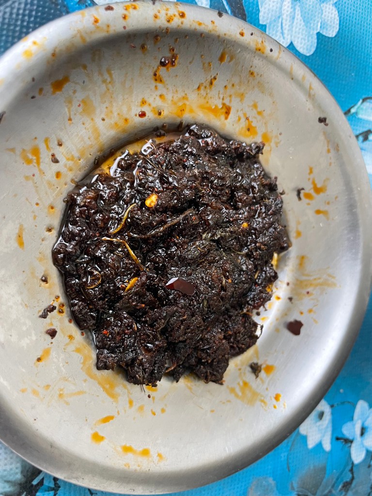 - Grind roasted mustard, methi, chilly and tamarind to coarse powder.